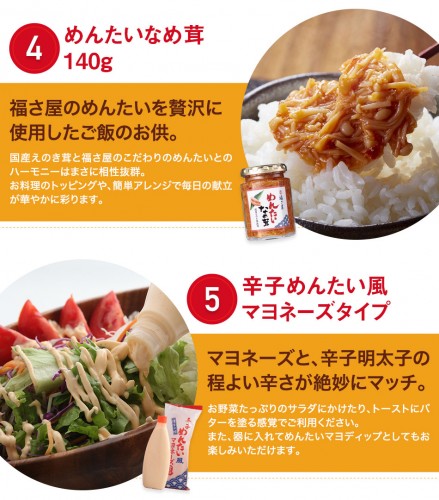 家庭用無着色 辛子めんたい(ムLFB180):180g めんたい辛子高菜:130g 辛子めんたい風ふりかけ:85g めんたいなめ茸:140g 辛子めんたい風マヨネーズタイプ:300g 博多長浜とんこつラーメン:3食分(めん90g×3/スープ29g×3) |