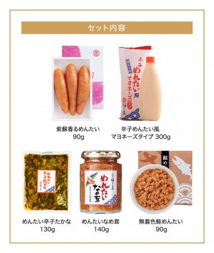 紫蘇香るめんたい:ー めんたい辛子たかな:高菜漬(高菜、食塩)、食用植物油脂、しょうゆ、砂糖、辛子明太子、唐辛子、食塩/調味料(アミノ酸等)、着色料(ウコン)、酸味料、ソルビット、酸化防止剤(ビタミンC)、ナイアシン(一部に小麦・大豆を含む) 辛子めんたい風 マヨネーズタイプ:ー めんたいなめ茸:えのき茸(国産)、キムチ味液(食塩、ガーリック、その他)、辛子明太子(すけとうだらの卵巣、食塩、その他)、醤油、砂糖、醗酵調味料、醸造酢、ヤンニンジャン、昆布エキス、かつお節エキス、唐辛子、寒天/調味料(アミノ酸等)、甘味料(ソルビット)、酸化防止剤(V.C)、酸味料、増粘多糖類、パプリカ色素、ナイアシン、発色剤(亜硝酸Na)、酵素、 (一部に小麦・りんご・大豆・ごまを含む) 無着色鮭めんたい:すけとうだらの卵(ロシア又はアメリカ)、鮭フレーク(鮭、食用植物油脂、その他)(国内製造)、食塩、発酵調味料、澱粉、唐辛子、かつお節エキス、昆布エキス、魚醤、米酢、酵母エキス/調味料(有機酸等)、甘味料(ソルビット)、酸化防止剤(V.C)、増粘多糖類、着色料(黄5、赤102)、ナイアシン、発色剤(亜硝酸Na)、酵素、(一部に小麦・さけ・大豆を含む) |