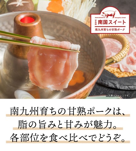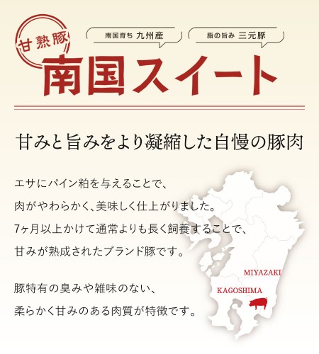 南九州育ちの甘熟ポークは、脂の旨みと甘みが特徴。肩ロース・ロース・バラ・モモの各部位をぜひ食べ比べてみてください!