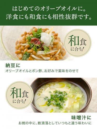 一農家製。 若い実と完熟した実を一緒に搾った上品な味と香りが特徴でマイルド。 パンやパスタ、サラダにはもちろん、和食との相性も抜群で、お豆腐や納豆、お刺身にお醤油やポン酢と一緒にかけて! ポン酢と合わせるだけでシンプルなドレッシングに!