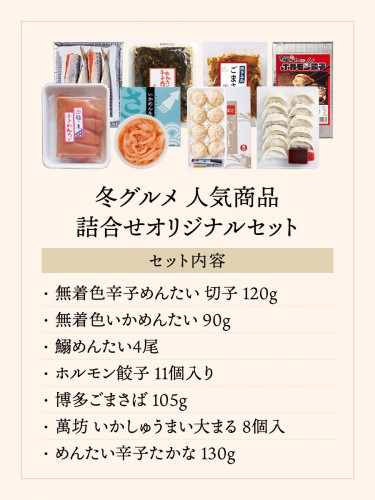 無着色辛子めんたい切子:120g いかめんたい:90g 鰯めんたい:4尾 天神ホルモン監修 ホルモン餃子:11個入り 博多ごまさば:105g 萬坊いかしゅうまい大まる:8個入り めんたい辛子たかな:130g |