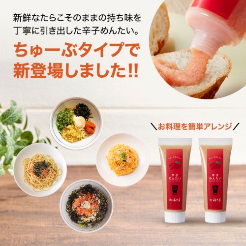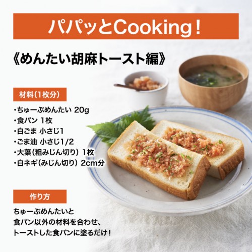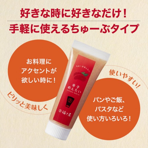 簡単、好きな時に好きなだけ使えるちゅーぶめんたい。お料理のアクセントが欲しい時や、パンやご飯、パスタなどにもささっと使えるスグレモノ!朝の忙しい時間にもおすすめです。