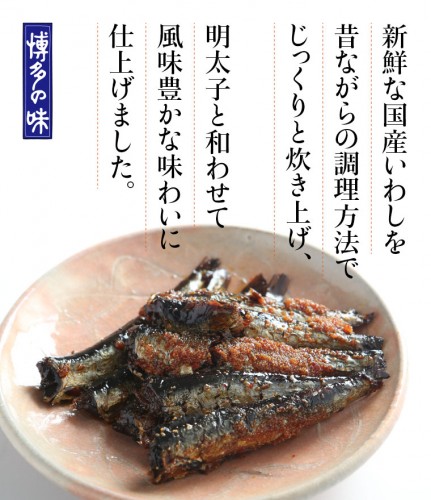 新鮮ないわしを昔ながらの調理方法でじっくりと炊き上げました。明太子と和わせて風味豊かな味わいにしあげました。あたたかいご飯やお酒のおつまみとして美味しくお召し上がりいただけます。